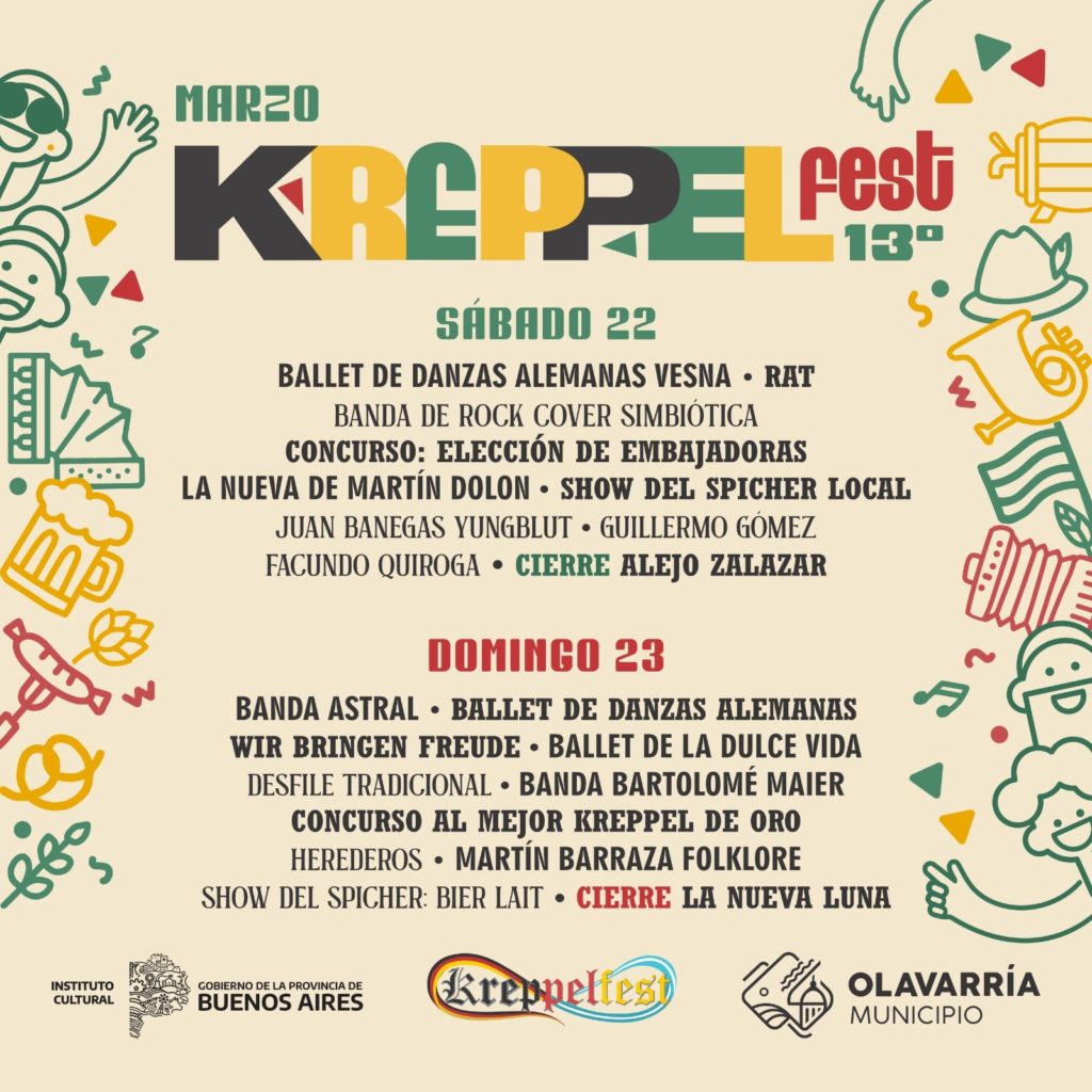 La decimotercera edición de unos de los eventos más convocantes de Olavarría y la región y más esperado ansiosamente no sólo por la comunidad de localidad sino por las y los centenares de visitantes que marcan en su calendario la fecha para no perderse la oportunidad de degustar los más sabrosos kreppel, pero también la oferta gastronómica que distintas instituciones y entidades desplegarán a lo largo y ancho de la avenida De los Fundadores.